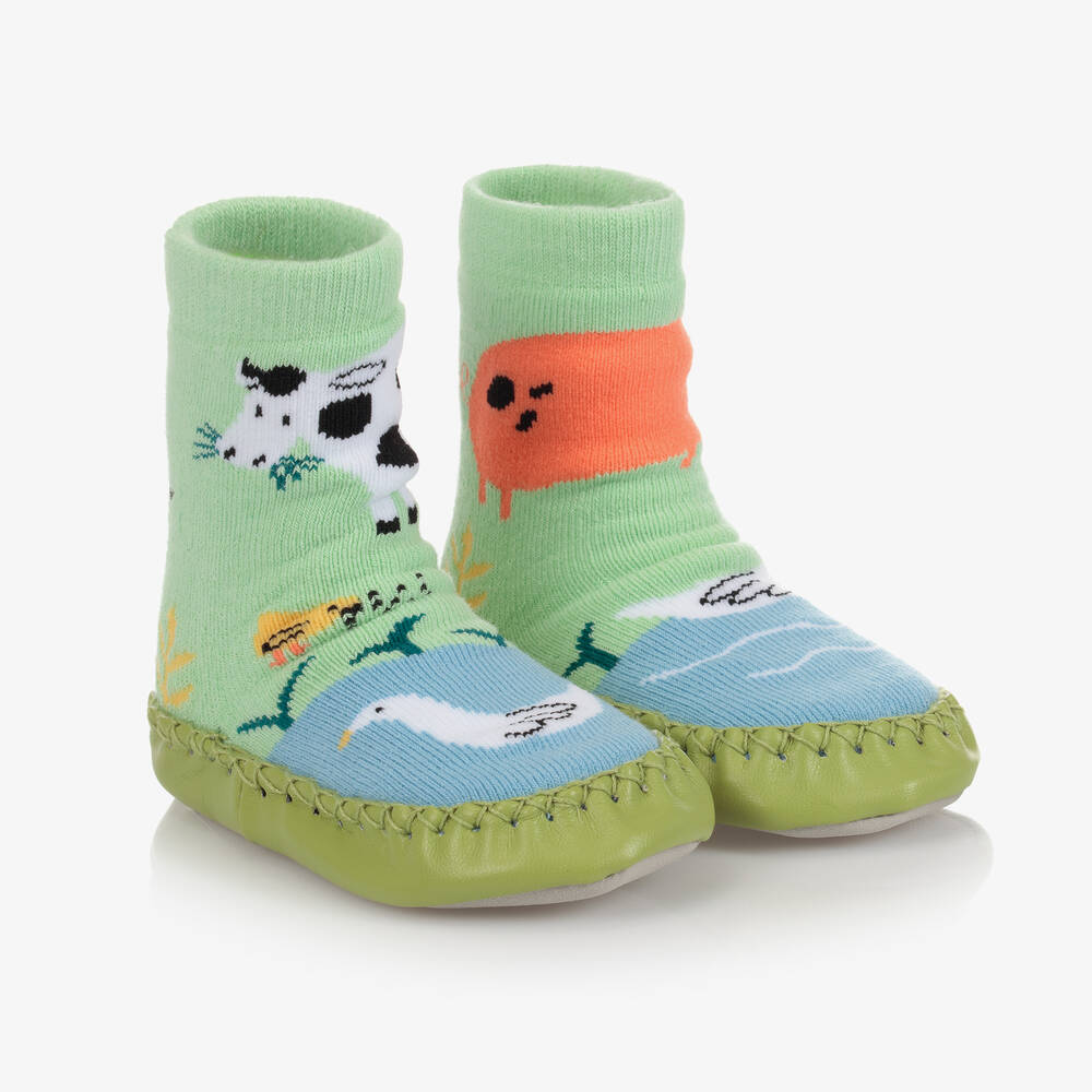 Green moccasin slipper socks for younger boys and girls from Powell Craft. Great for keeping feet cosy, the base is made from non-slip faux leather and the cotton-rich socks have a farmyard animal design in green, blue and orange.