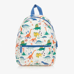 Printed with a fun and colourful dinosaur pattern, this ivory backpack for boys and girls is by Powell Craft. Made from smooth material with a lightweight woven lining, it has blue adjustable straps and a useful top handle for hanging on a hook. Fastening with a zip, the spacious main compartment has an internal slip pocket and a handy external zipped pocket on the front.