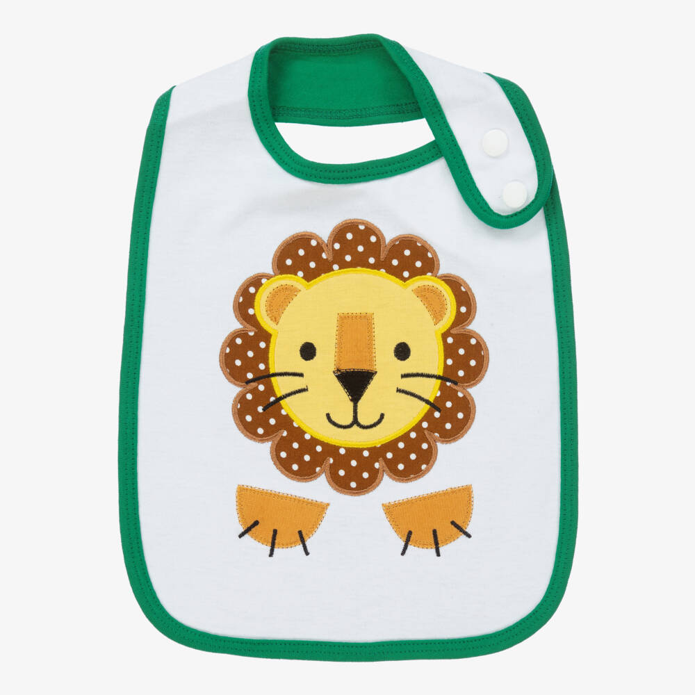 Make baby meal times fun in this cute brown and white cotton bib from Powell Craft. It is suitable for boys and girls, with a cute lion character appliquéd on the front. It has a useful side popper fastening and a soft green jersey lining.