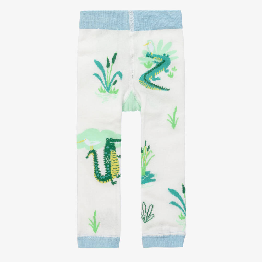 Sweet white leggings for little boys and girls by Powell Craft, made in a soft cotton knit with a cute green crocodile design. They are soft and stretchy, and can also be worn as footless tights.