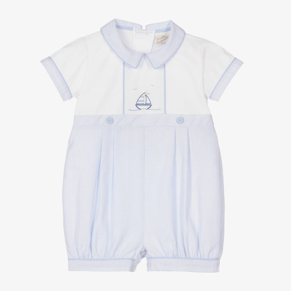 Traditional pale blue and white striped cotton blend shortie for baby boys by classic British brand Pretty Originals, with the appearance of a buster suit. Made in lightweight poplin, it has a cute boat embroidered on the bodice, blue piping, decorative buttons and pleats. It fastens with buttons on the back and between the legs.