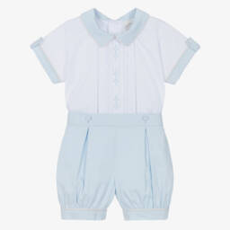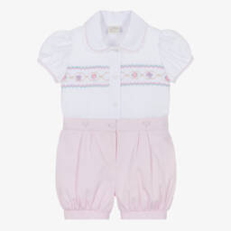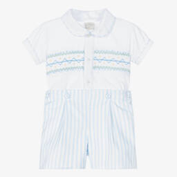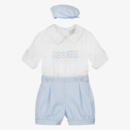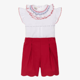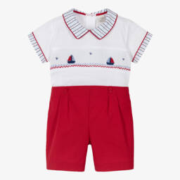 Smart ivory and red tartan shorts set for little boys by British brand Pretty Originals, with traditional red and navy blue hand smocking and embroidery on the bib of the shirt. The long-sleeved, herringbone shirt is made in a soft, cotton blend, with red piping and button fastenings on the cuffs and back. The red tartan shorts are made in lightweight cotton twill with front patch pockets and an elasticated waistband around the back. The shirt buttons onto the shorts, keeping boys neat and tidy.
