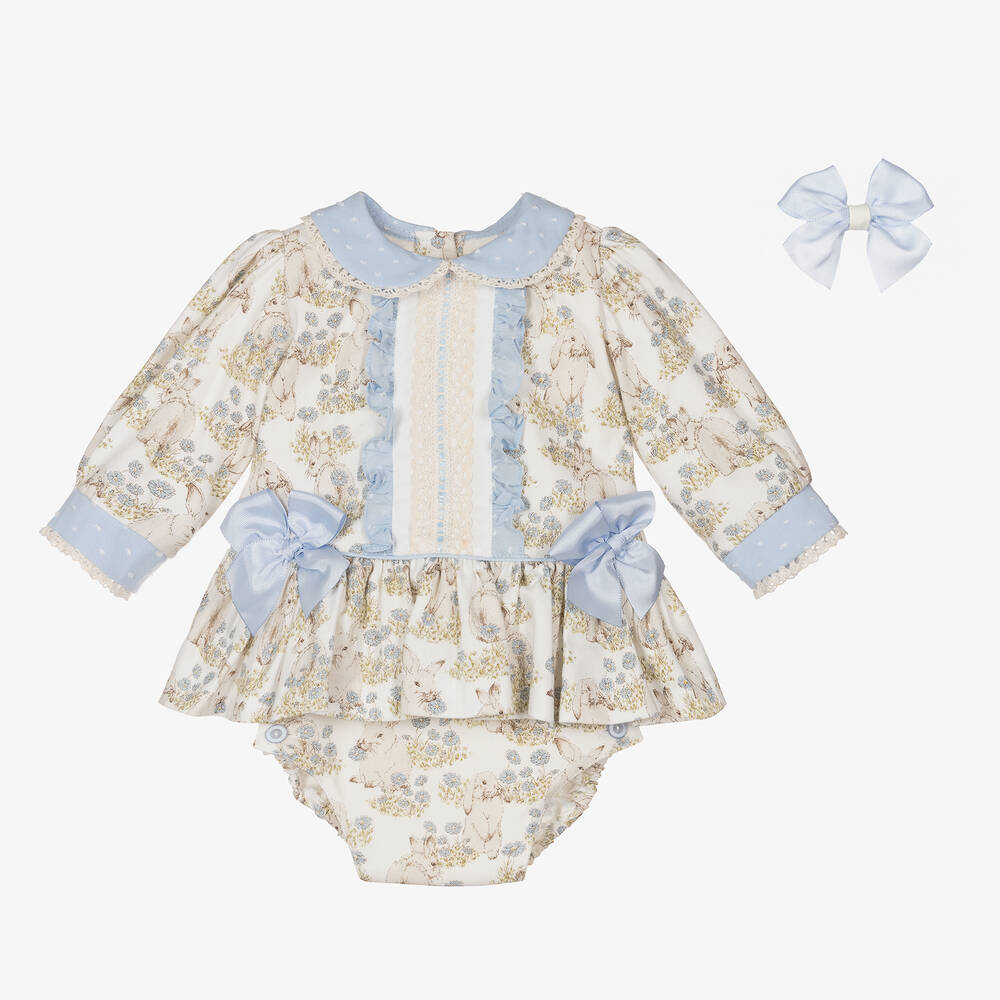 An adorable ivory and pale blue dress set for baby girls by British brand, Pretty Originals. Made from soft viscose and cotton blend weave, both the dress and the knickers are printed with a charming floral bunny rabbit pattern. Trimmed with ivory lace, the dress has pale blue Peter Pan collar with tufted detailing that matches the buttoned cuffs and the frills on the chest. Fully lined, it fastens with buttons on the back and has grosgrain ribbon bows that coordinate with the pretty hair clip. The knickers button-up at the sides and have a partially elasticated waist for a comfortable fit.