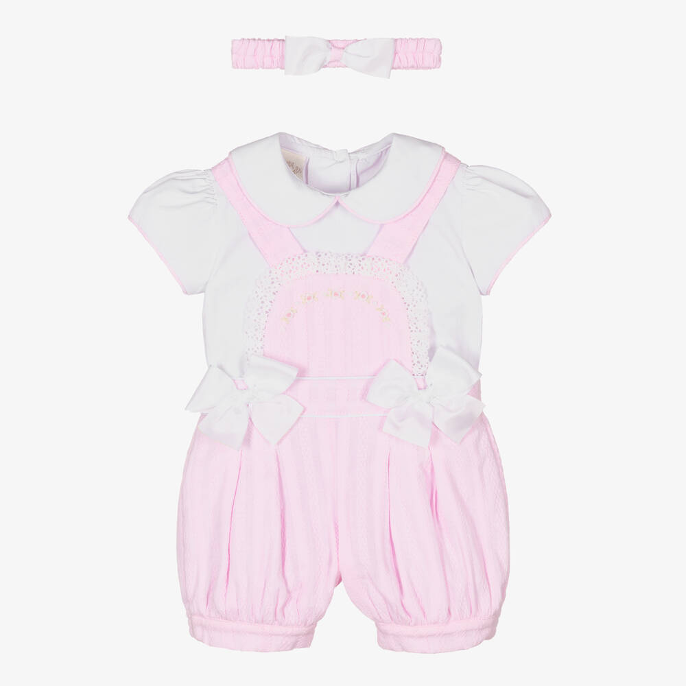 Charming pink dungaree shorts set for baby girls from British brand Pretty Originals. The white cotton twill blouse has sweet pink piped trims and button fastenings on the back for a neat finish. The pink cotton dungaree shorts have all-over tonal embroidery and two grosgrain ribbon bows for a feminine look. The bib of the dungaree shorts has delicate floral embroidery and is trimmed with lace. A matching pink headband with a large bow on the front completes the look.