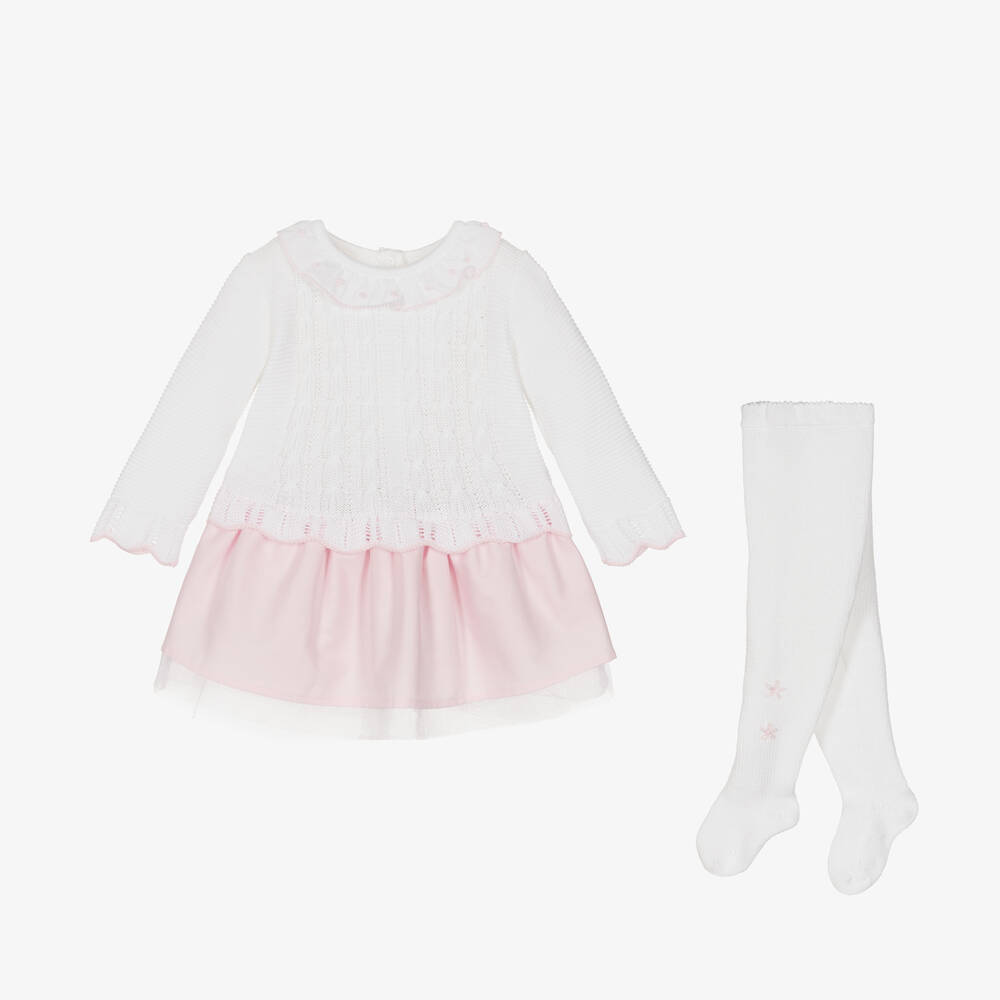 Lovely white and pink dress set for baby girls by Pretty Originals, knitted in soft cotton. The popper-fastening bodice is made with sweet cable knit trims, scalloped details and a traditional ruffle collar. The pink twill skirt has layers of soft tulle underneath for added volume. Knitted white tights, with delicately embroidered pink flowers, complete the look.