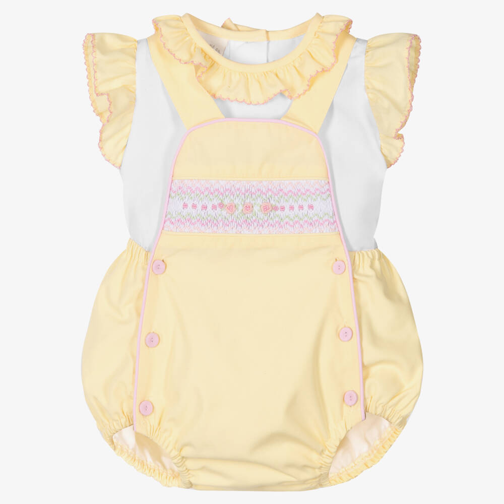 Cute yellow dungaree set for baby girls from British brand Pretty Originals, made in cotton blend twill. The yellow dungarees have pink piping and a beautiful hand-embroidered smocked panel on the front. For easier dressing, there are pink fabric-covered buttons on the front and to ensure a neat finish, the straps fasten internally. A white blouse with matching yellow trims and pink picot embroidered trims completes the look.