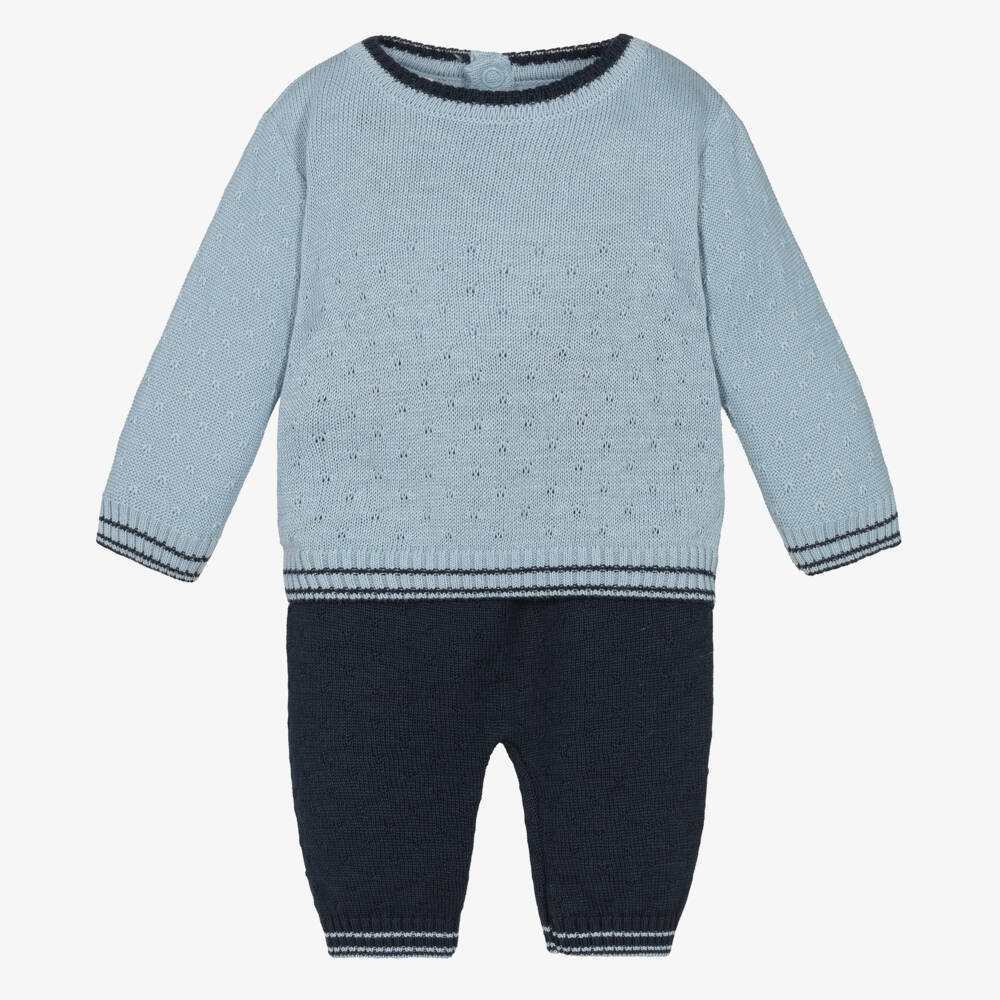 Lovely blue cotton trousers set for little boys by Pretty Originals. In a soft and lightweight knit, the blue sweater has contrast navy blue trims and gently ribbed hems. It fastens on the back with poppers for easy dressing. The coordinating navy blue trousers have an elasticated waist for a comfortable fit on little tummies.