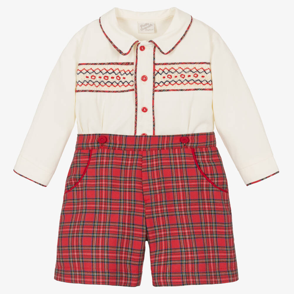 An ivory and red cotton shorts set for little boys by classic British brand Pretty Originals. The shirt is intricately hand-smocked and hand-embroidered, with a tartan-trimmed collar and button-up placket for heritage styling. It fastens smartly onto the matching tartan shorts with fabric-covered buttons, keeping the shirt neatly tucked in. The shorts have pocket detailing and a gently elasticated back.