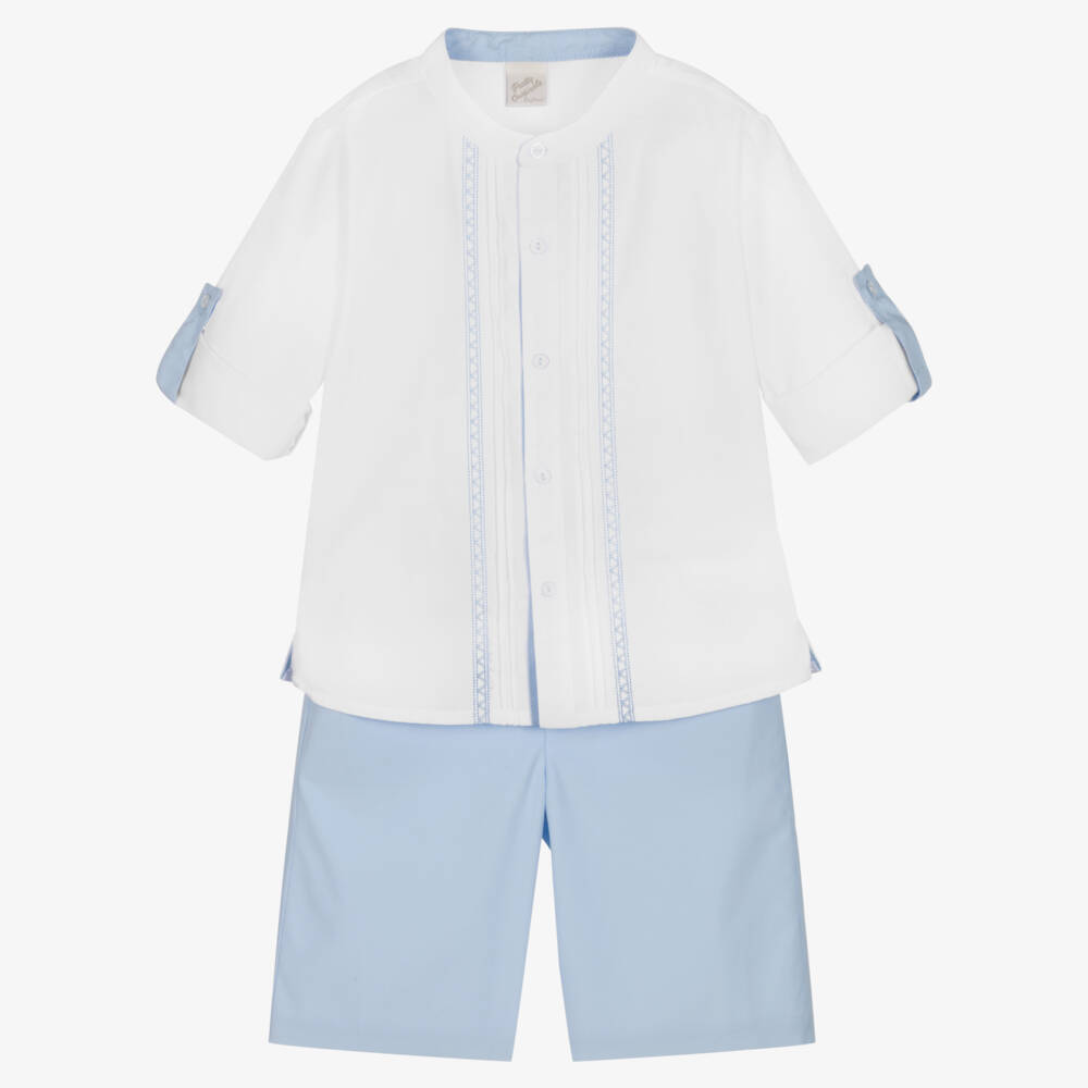 Smart white and blue shorts set for boys by British brand Pretty Originals, made in a soft cotton blend. With a timeless, traditional look, the collarless white shirt has blue embroidery down the front with pin tuck detailing. The sleeves can be buttoned up for a turned-up look or rolled down. It pairs with pale blue Bermuda shorts, which have a front button and zip fastening, and an elasticated waist for a good fit.