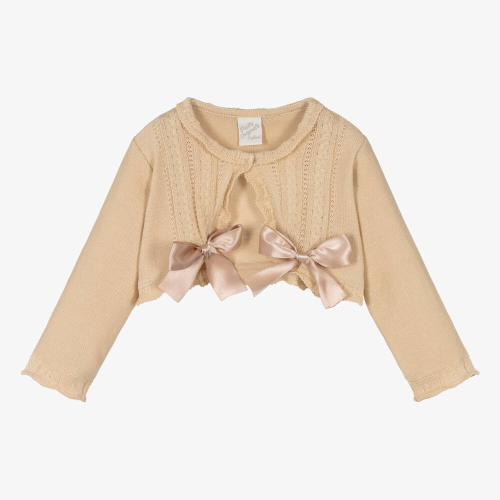 So lovely for girls, this beige cotton cardigan is from British designer Pretty Originals. Softly knitted, there are silky decorative bows stitched on the front and smart cable knit details. This scallop-edged piece fastens with a hidden button on the front for a seamless look.
