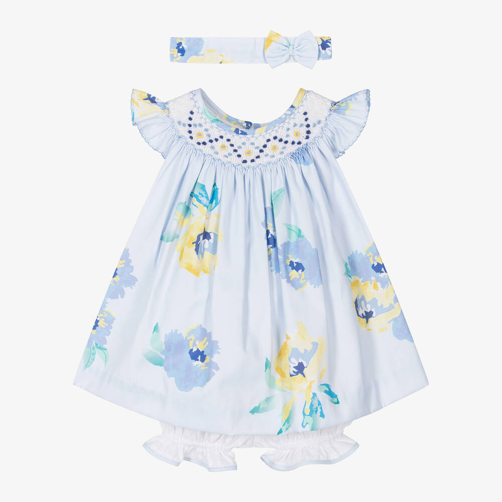 Lovely light blue dress set for little girls by Pretty Originals, made in soft, lightweight cotton and patterned with blue and yellow flowers. It features a hand-smocked panel across the front with charming hand-embroidered diamonds and florals and fastens with buttons on the back. It comes with white bloomer shorts and a matching floral headband to complete the outfit.