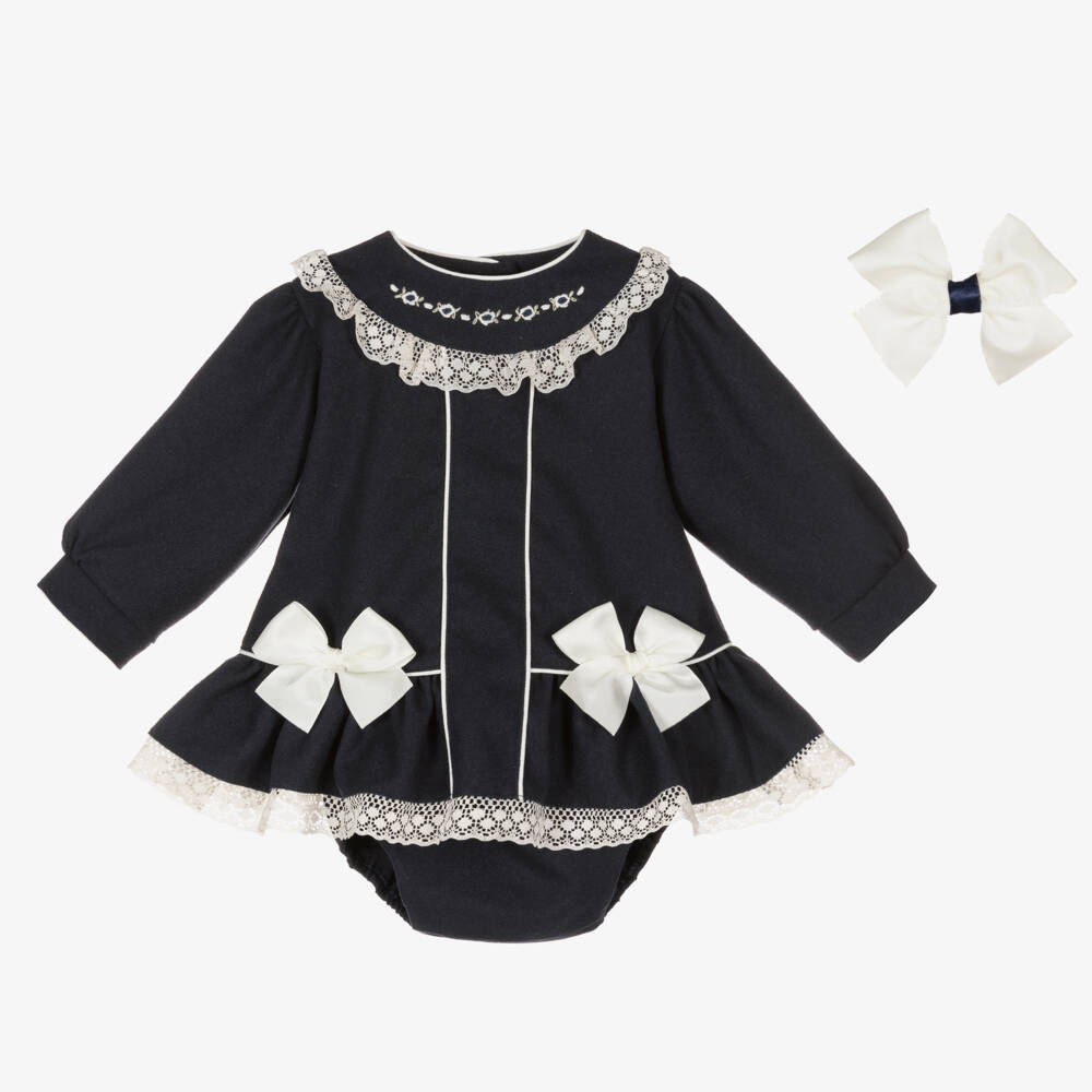 Lovely navy blue dress set for little girls by British brand Pretty Originals. This traditional, soft and mid-weight dress has sweet puffed sleeves and pretty hand-embroidered flowers at the neckline. It is trimmed with white piping and delicate lace, with attached ribbon bows. Fully lined for comfort, it fastens on the back and cuffs with buttons. The dress comes with matching knickers that have a gently elasticated back and fasten with side buttons. There is a pretty ribbon bow clip to complete the look.