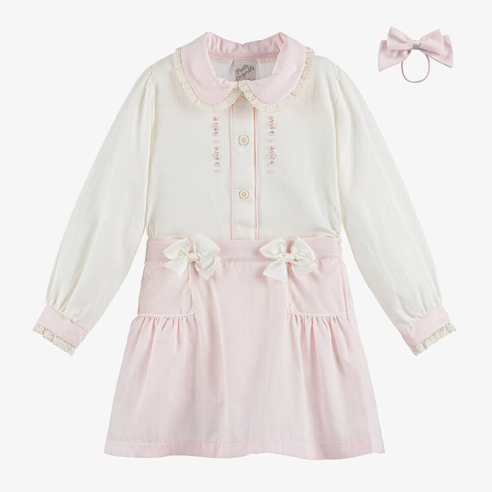 A lovely ivory and pale pink skirt set for girls from Pretty Originals, woven in a cotton blend with a subtle herringbone pattern. Buttoning up on the front, the long-sleeved blouse has beautiful lace trims and tiny rose hand embroidery detailing. Lined for comfort, the flared skirt is decorated with cute ivory bows on the front of the partially elasticated waist. Completing the pretty look, the set comes with a matching pink bow hair elastic.