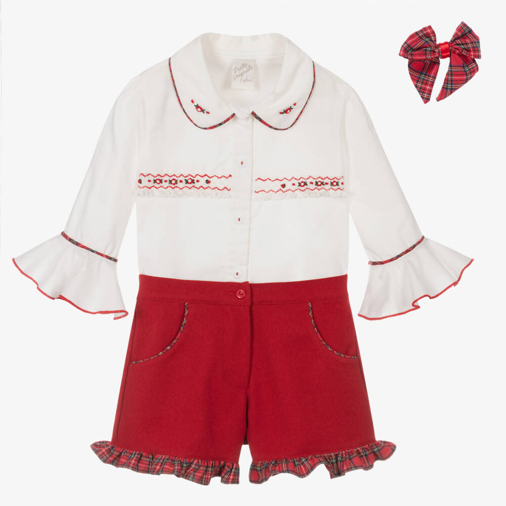 Girls pretty shorts set by traditional British brand Pretty Originals, with red tartan piping on both the blouse and shorts. The white cotton blouse has lovely red, hand-embroidered flowers on both the collar and the frilled hand smocking across the chest. There are flared cuffs, edged in red, on the puffed sleeves and button fastenings on the front. The red, soft twill shorts have tartan frills on the cuffs and useful side pockets. The comfortable waistband is elasticated around the back and fastens with a front button and zip. A red tartan bow hair clip completes the set.