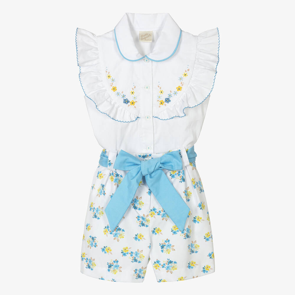 Girls white and blue buster suit by Pretty Originals, embroidered by hand with lovely blue and yellow flowers. The sleeveless blouse has a rounded collar, a ruffle-trimmed bib front and useful button fastenings on the front. The floral print shorts have a statement blue bow on the elasticated waist for a girly look. The blouse can be buttoned to the shorts to give the illusion of a neatly, tucked in look.