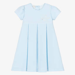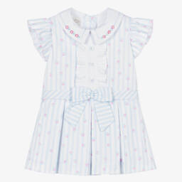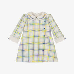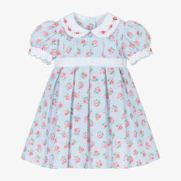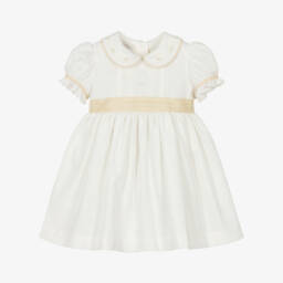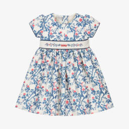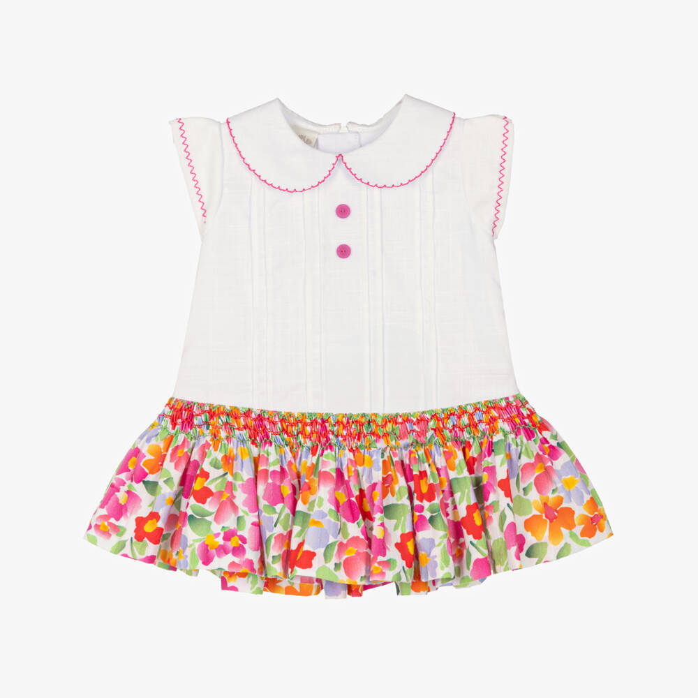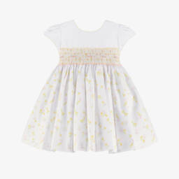Pretty white dress for little girls by Pretty Originals, made in soft cotton. It has neat pintucks on the front with button trims and pink embroidery. It has a dropped waist and a brightly coloured, floral print skirt with hand-smocked detailing. Fully lined for comfort, it fastens neatly on the back with a concealed zip.