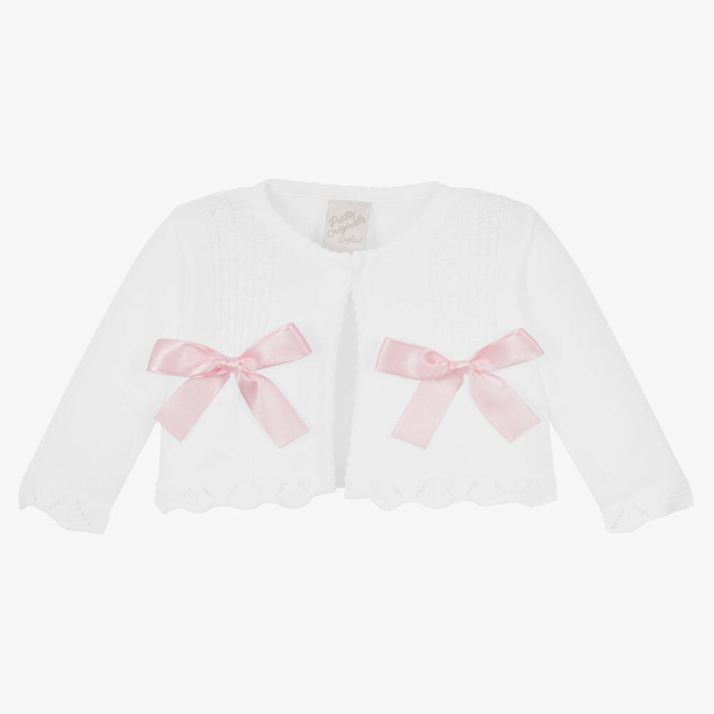 Lovely white cotton cardigan for girls by Pretty Originals. Softly knitted, there are decorative satin bows stitched on the front and delicate cable knit detailing embellished with pearl beads. Fastening with a single button, it has scalloped trims, ideal for adding a pretty finishing touch to any outfit.