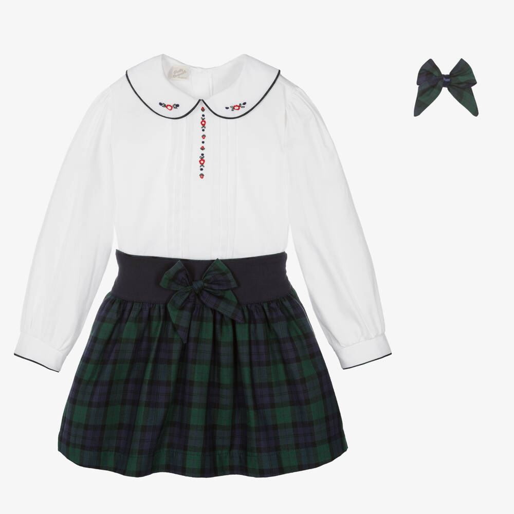 Girls White & Green Tartan Skirt Set