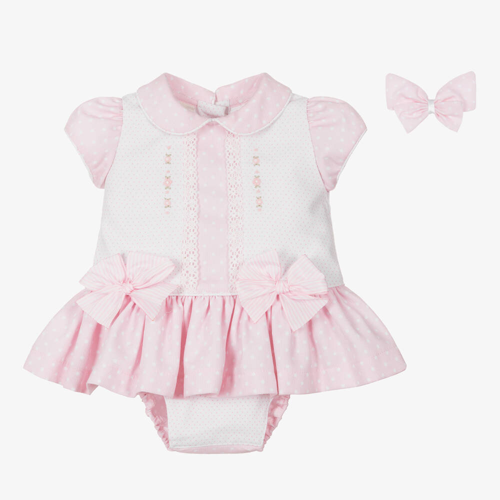 A charming dress set for little girls by Pretty Originals, in white and light pink. Made in a mid-weight cotton-blend weave, both pieces are beautifully decorated with polka dots in a mix of sizes. With a smart collar, the short-sleeved dress has lace detailing, hand-embroidered florals, and striped bows on the front. Pink buttons fasten the fully lined dress on the back for a coordinated look. The knickers have a front lining and button closures on the sides. Completing the set is a dotted double bow hair clip.
