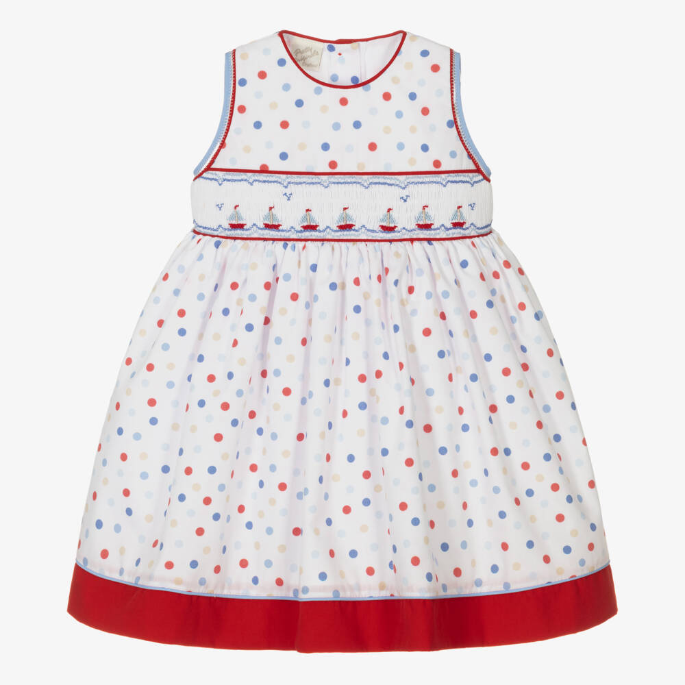 Pretty white sleeveless dress for girls, by Pretty Originals. Crafted in soft poplin, it has a playful blue, beige and red polka dot print all-over with delicately embroidered trims. The traditionally styled hand-smocked panel has adorable blue boats and gives the dress a timeless feel. Lined in soft lace-trimmed cotton, it has button fastenings and a statement red tie-up bow on the back to tie the look effortlessly together.