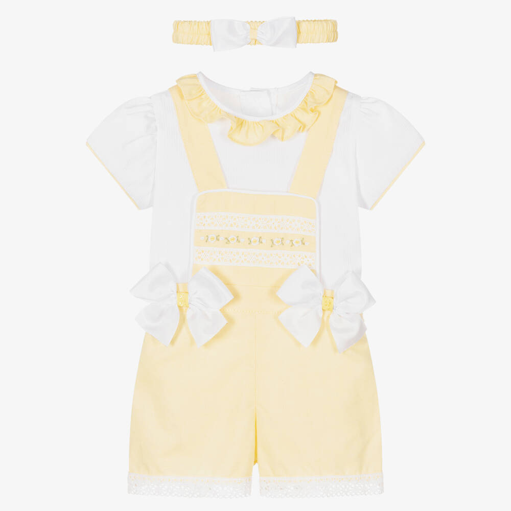Traditional white and yellow dungaree shorts set for little girls, by Pretty Originals. Woven in soft cotton, the decorated shorts have embroidered lace, romantic statement bows and adjustable cross-over straps. The matching puffed sleeve blouse has a pastel yellow frill and subtle button fastenings on the back. Beautifully paired with the matching yellow headband, this outfit is ideal for a charming look.