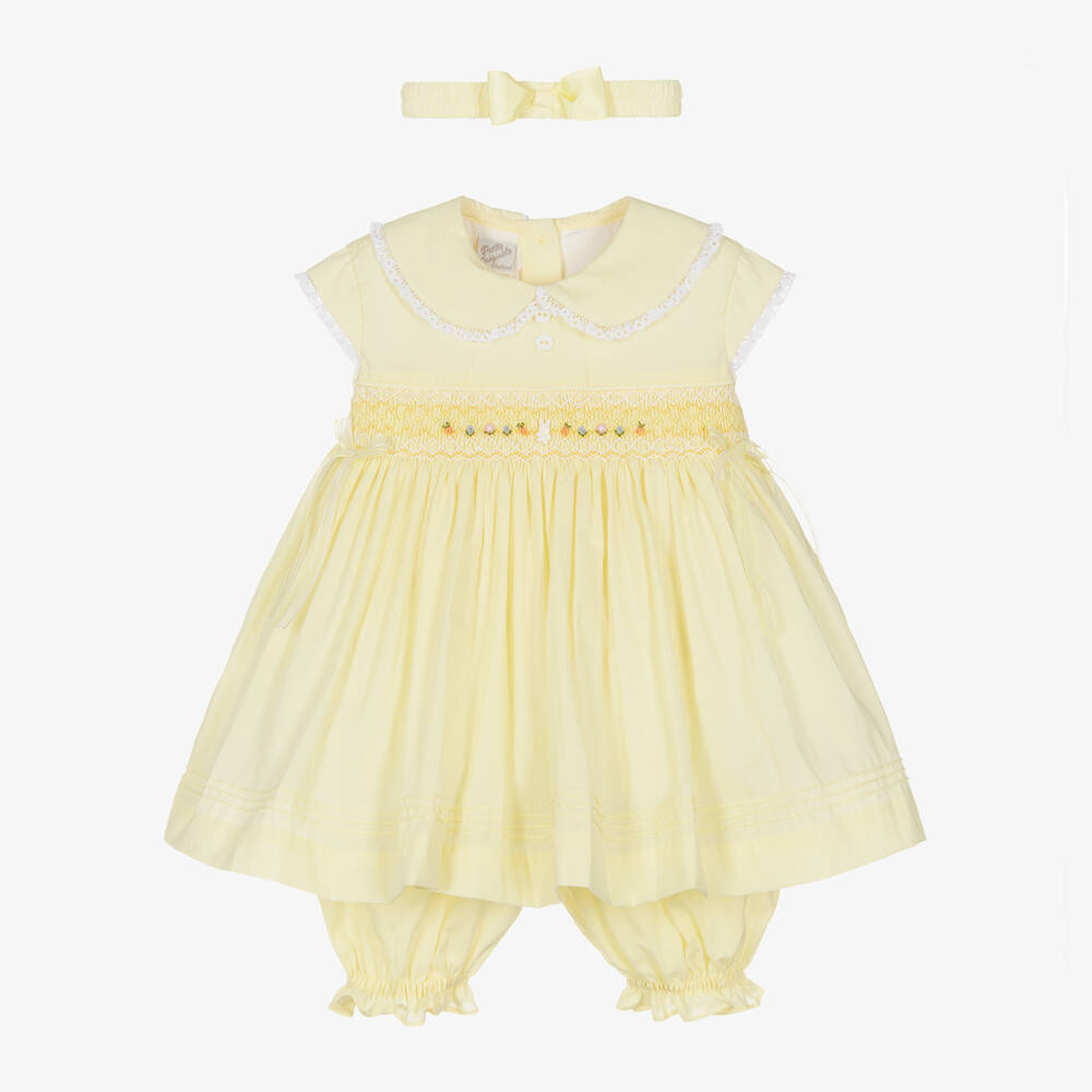 Beautiful traditionally-styled yellow dress set for little girls by Pretty Originals, made in soft, lightweight cotton. The dress has a lovely hand-smocked panel across the bodice with colourful, hand-embroidered flowers, a central white rabbit appliqué and sweet organza ribbon bows on the sides. It has a rounded collar and capped sleeves, both trimmed in delicate white lace. It has pintucks around the hemline and fastens on the back with buttons and a fixed sash. It is lined in soft cotton voile for comfort. Coordinating bloomers with gently elasticated, frilled cuffs and an elasticated headband with a grosgrain bow complete the set.