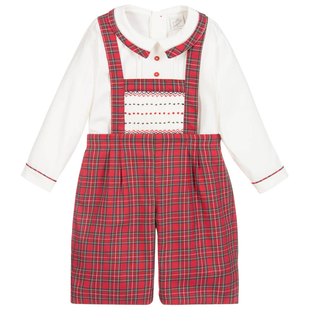 Traditionally styled by Pretty Originals, a red and ivory short set for younger boys. The soft ivory cotton shirt has delicate pleats on the front, a small pointed collar and red tartan trims. The red tartan dungaree shorts are made from soft brushed cotton twill, with an ivory smocked panel on the front. Fully lined for comfort, they have red and back embroidery, adjustable shoulder straps and a lightly elasticated waistband.
