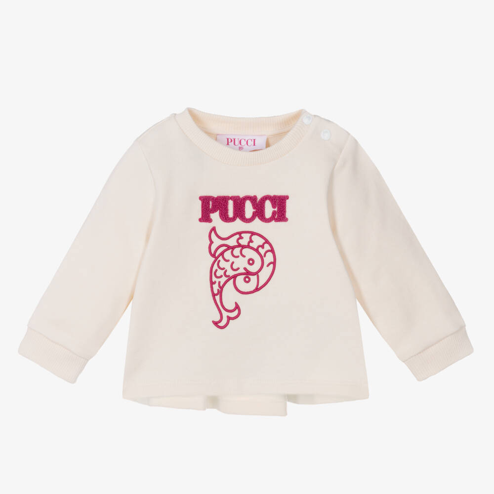 Lovely ivory sweatshirt for baby girls by luxury Italian brand PUCCI, made in the softest organic cotton jersey. Comfortable to wear, it is gathered at the back to give a pretty flared shape. It has a pink bouclé logo on the front, with the brand's signature fish motif below. The branded popper fastenings on one shoulder allow it to fit easily over your little one's head.