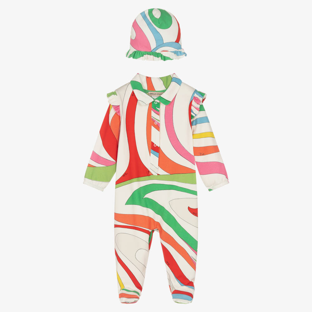 An Italian-made cotton babygrow and hat set for baby girls from Emilio Pucci. Renowned for their psychedelic prints, the luxury fashion house has designed both pieces with a wonderful Marmo pattern in beautifully vibrant shades. The label's branding can be found amongst the richly decorated print for an extra designer detail. In soft and stretchy jersey, both pieces will be gentle and comfortable on delicate skin. The babygrow has a smart collar, front popper placket and ruffles across the shoulders. The double-layer hat is trimmed with frills on the brim for a coordinated look. Presented in a box, the set would make a lovely gift.
