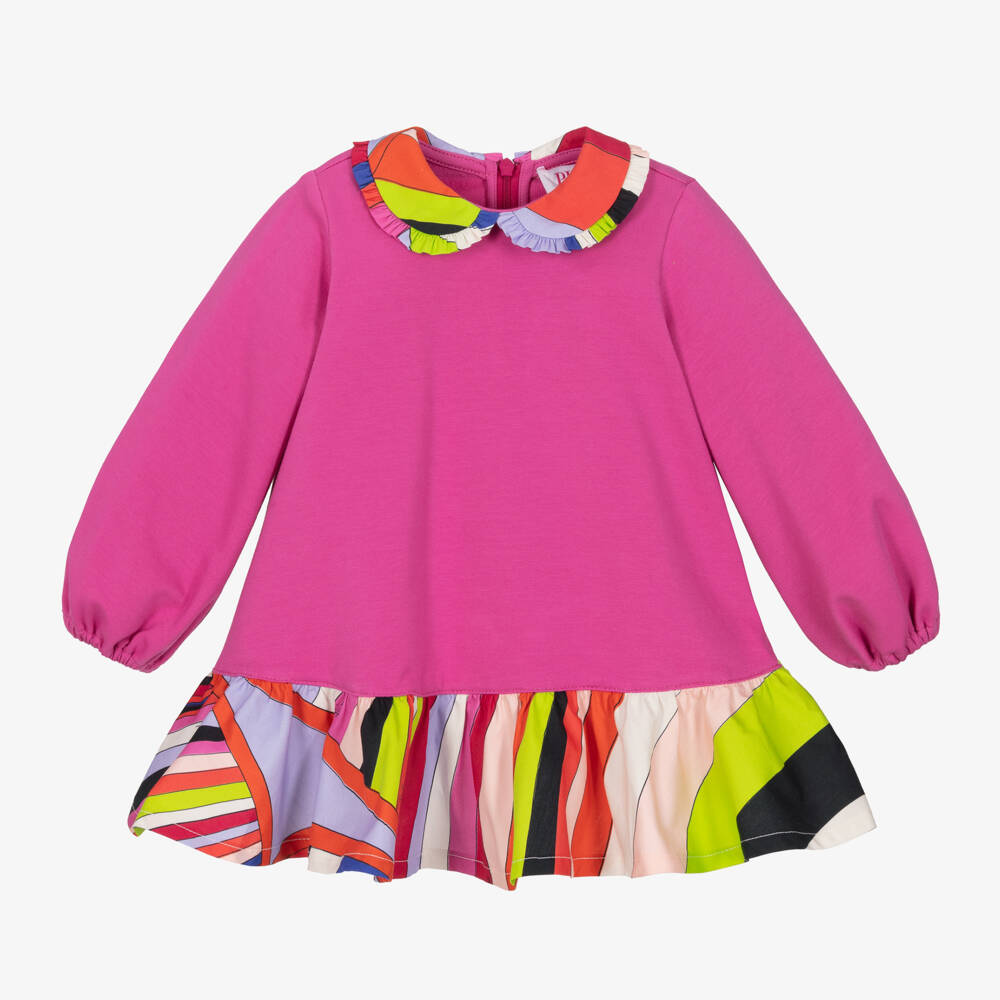 Bright fuchsia pink dress for baby girls by luxury Italian brand PUCCI. Made in mid-weight cotton jersey, it has a pretty ruffle hem and frill-trimmed collar, both patterned with the designer's distinctive multicoloured Iride print. The dress has long sleeves with elasticated cuffs and a concealed zip fastening on the back. It comes with a pair of matching fuchsia pink bloomers.