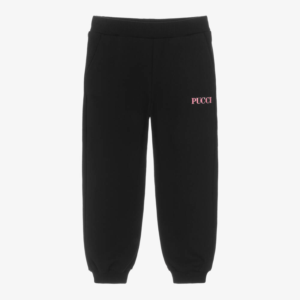 Simply stylish black cotton joggers for girls from Italian brand PUCCI. They are made from luxury soft and comfortable sweatshirt jersey in a slouchy fit with ribbed ankle cuffs and elasticated waistband. There are two side pockets with a pink logo underneath one, and a back pocket in the fashion house's iconic Iride print, adding a splash of colours to this casual wardrobe staple.