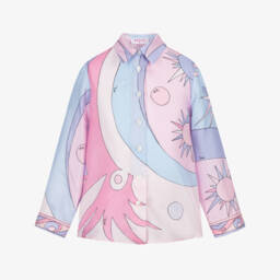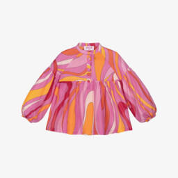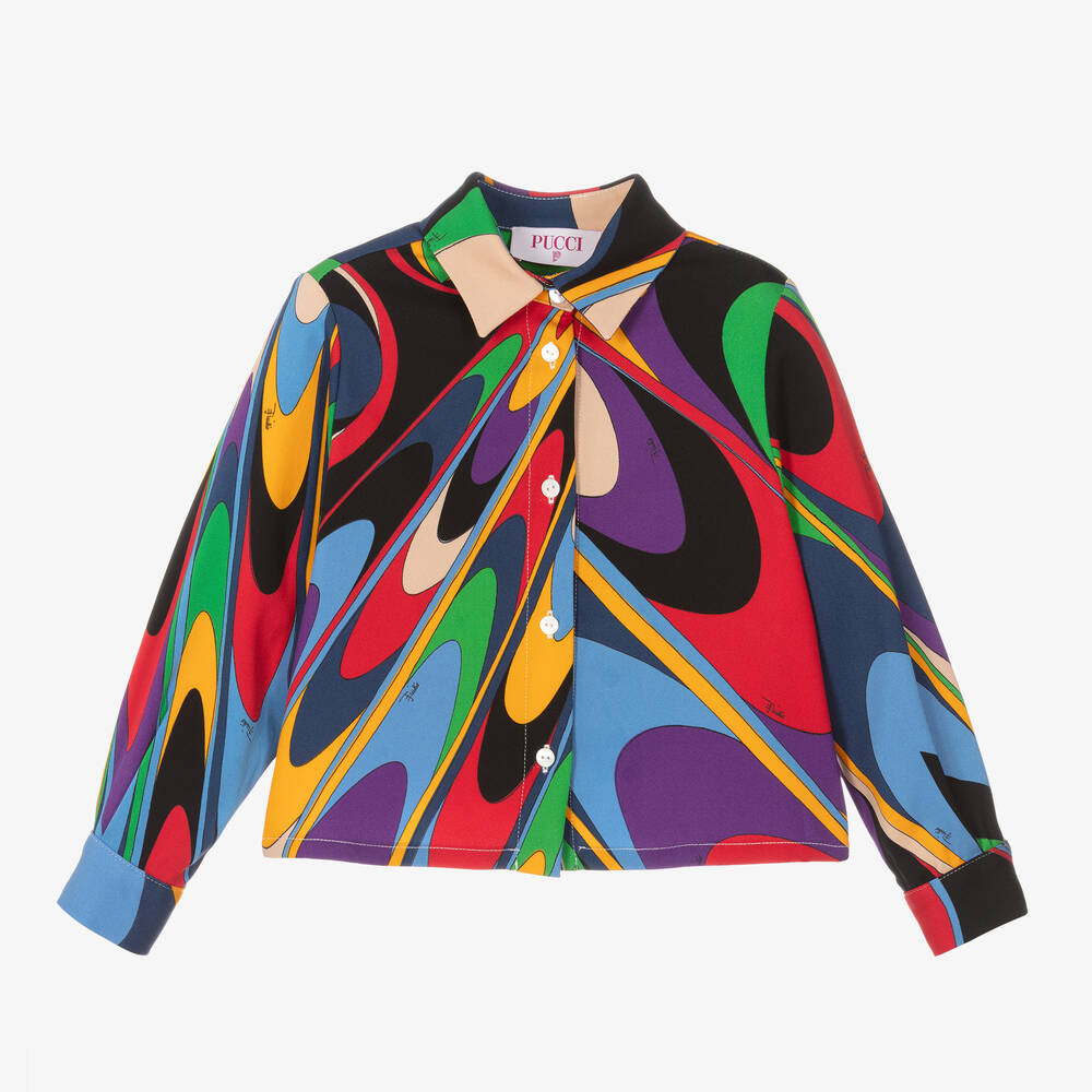 With a strong Pucci identity, this striking blouse for girls is designed in contrasting shades of purple, red and blue against a black background. Characterised by the luxury Italian brand's Onde swirls, this bold, abstract top is made in lightly textured viscose fabric with added stretch. It has long sleeves with buttoned cuffs and a neat collared neckline. The branded buttons and delicate white topstitching add extra detailing, while the split side vents ensure an even fit on the waist.