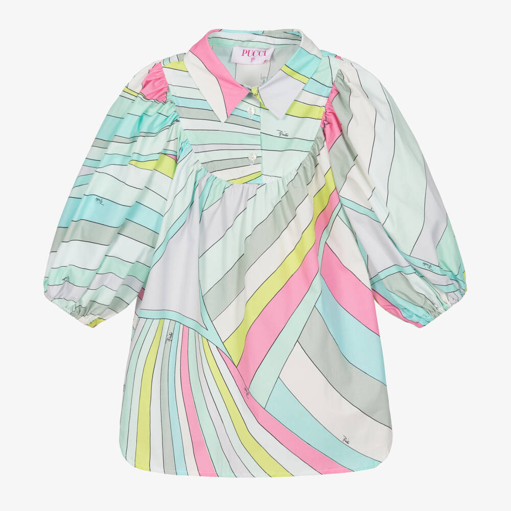 Pretty dress for girls by luxury Italian brand PUCCI, made in lightweight cotton poplin. It is patterned in the designer's distinctive pastel Iride print in shades of green, pink, white and grey. This stylish dress has full, three quarter length sleeves with elasticated cuffs and a stylish curved hemline. Cool and comfortable, it has a pointed collar and branded button fastenings on the front.