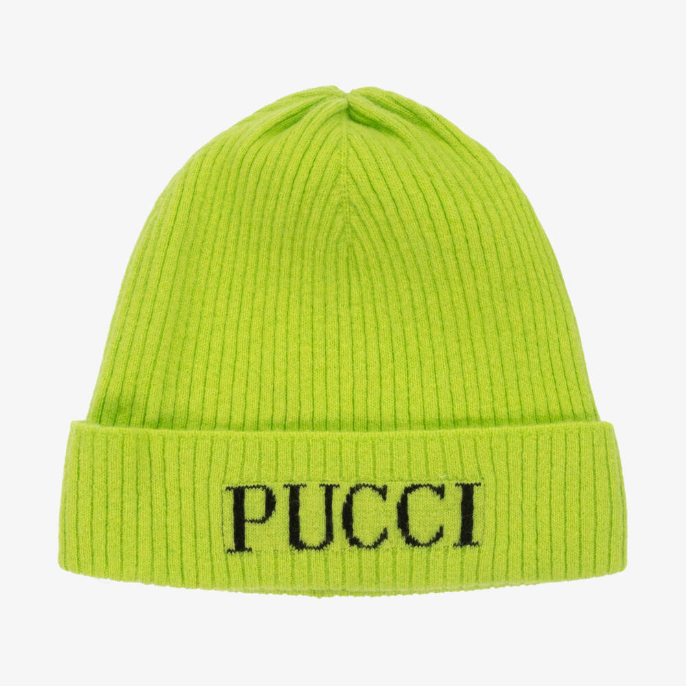 A bright green beanie hat for girls by luxury Italian brand PUCCI. Knitted in the softest wool and cashmere blend, this hat features the PUCCI logo in black for instant designer appeal. It comes with a drawstring bag for neat storage, printed with the signature fish motif.