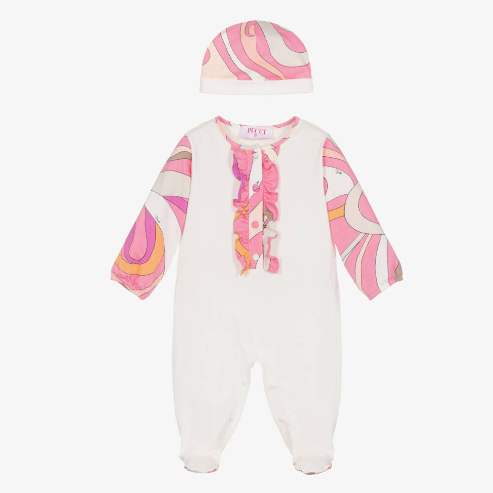 A lovely ivory and pink babygrow and hat set by luxury Italian brand PUCCI, made in beautifully soft cotton jersey. Presented in a smart gift box, the coordinating pieces are designed with the eye-catching Marmo print. The babygrow has a pretty ruffle-trimmed button placket on the front and popper fastenings between the legs to make changing easier. The hat is fully lined and has an ivory turn-up brim.