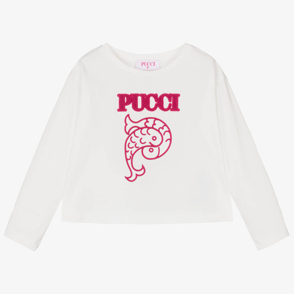 Casual ivory long-sleeved top for girls by luxury Italian brand PUCCI, made in soft organic cotton jersey. It is designed in a cool boxy fit and is gathered at the back to give a lovely flared shape. A pink bouclé logo is on the front for designer appeal, with the brand's signature fish motif below.