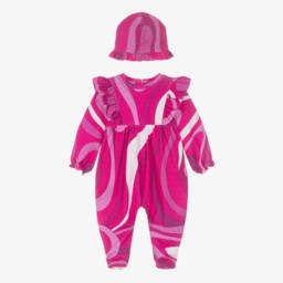 A charming ivory babysuit set for girls by luxury label PUCCI, featuring the Italian brand's Iride print in a pretty pink colourway. A lovely gift for a special new arrival, the set is presented in a smart, branded box. The babygrow has a stylish overlay and easy-to-use popper fastenings. The set comes complete with a matching layette hat and useful bib.