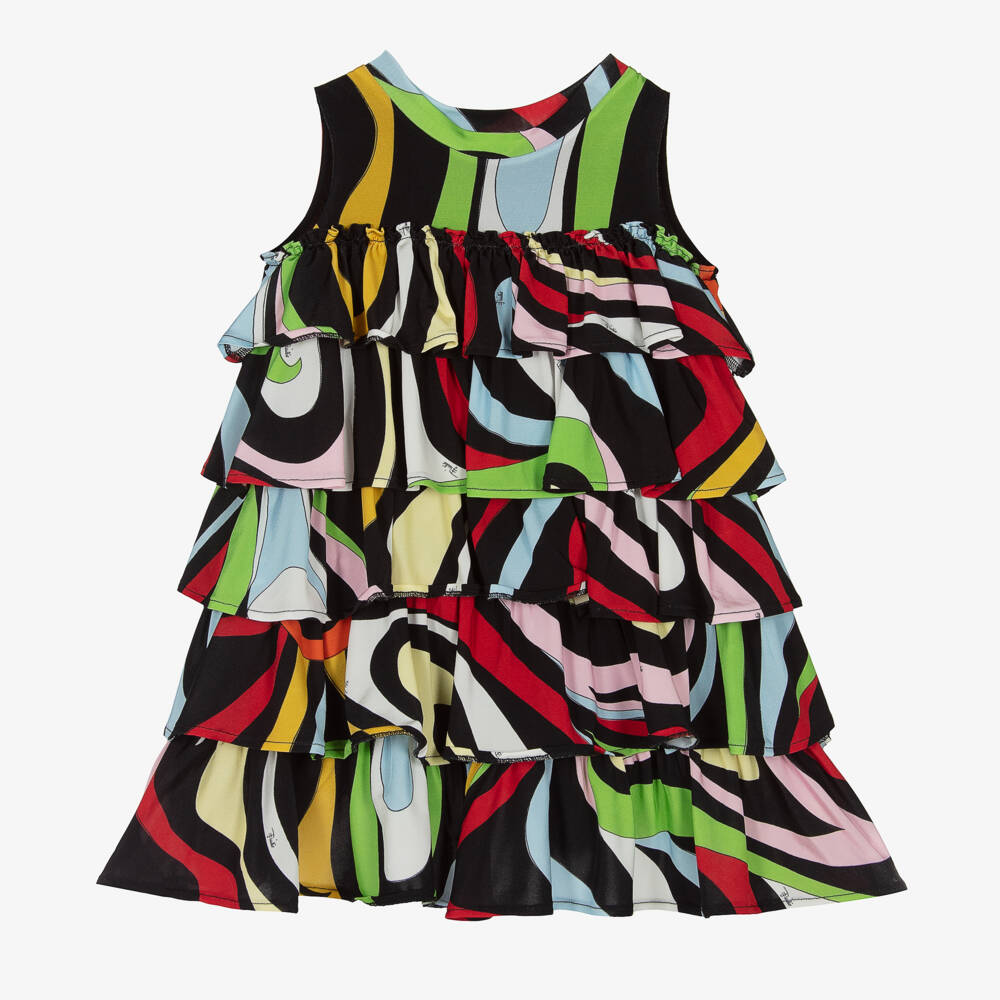 A lovely Mini-me dress for girls, in a bold and colourful Marmo print, a signature look by Emillio Pucci. Ultra stylish yet comfortable, it is made in a luxury soft viscose jersey in a sleeveless, tiered look. The Italian designer's subtle script logos are blended amongst the pattern.