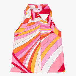 Light pink blouse for little girls by Italian designer PUCCI, made in a lightweight viscose blend with a beautiful soft drape. This boxy style has a scalloped hem in a bold pink and blue Iride print. The brand's name is embroidered on the chest for a luxurious finish.