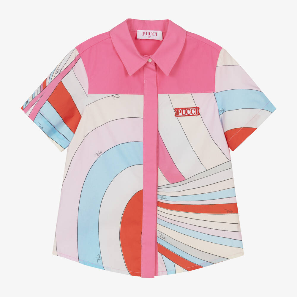 Pink shirt for girls from renowned fashion house PUCCI, with an embroidered logo appliqué on the front. This short-sleeved style is woven in soft organic cotton poplin, comfortable and gentle on the skin. Undeniably designer, the brand's archival Iride print in red, blue and ivory decorates the lightweight fabric. The branded mother-of-pearl front buttons are hidden beneath the pink placket.