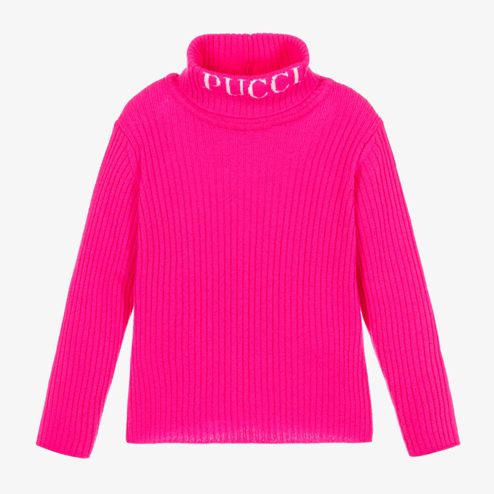 Bright neon pink sweater for girls by luxury Italian brand PUCCI, knitted in beautifully soft wool with a touch of cashmere for added luxury. This eye-catching ribbed sweater has a white intarsia logo on the front of the cosy roll neck for a subtle designer finish.