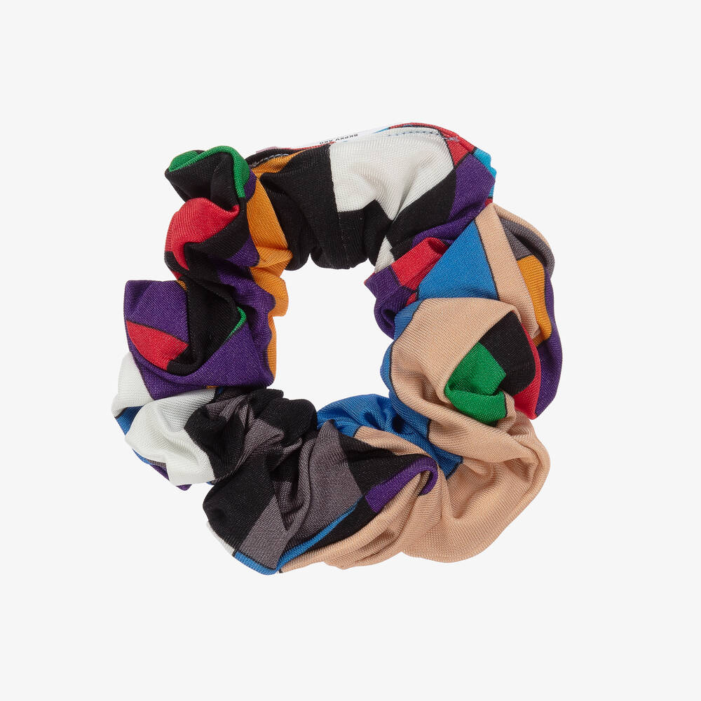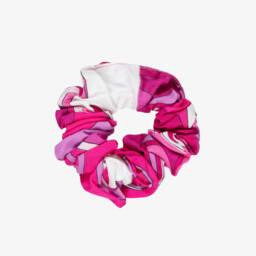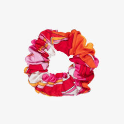 A delightful scrunchie for girls by luxury label Pucci. Patterned in their iconic multi-coloured Giardino print featuring lovely purple, orange, and blue shades, it will add a fun and colourful pop to any outfit. Easily to glide in and out of the hair, it is made from a silky smooth viscose twill covering a stretchy hair elastic.