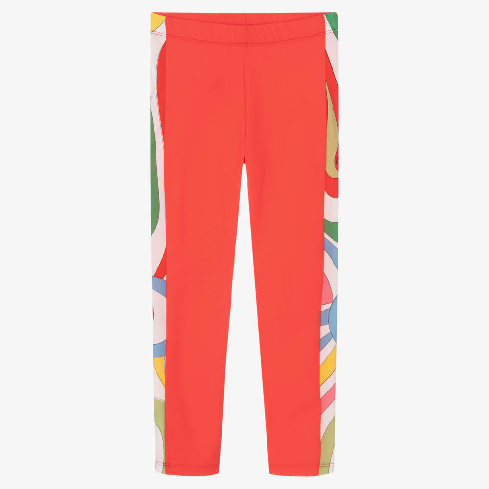 Girls bright red leggings from luxury brand Emilio Pucci, made in silky and stretchy sports jersey. They have Marmo print strips down each leg for a fun contrast. Cool and comfortable, they are full length and have an elasticated waist.