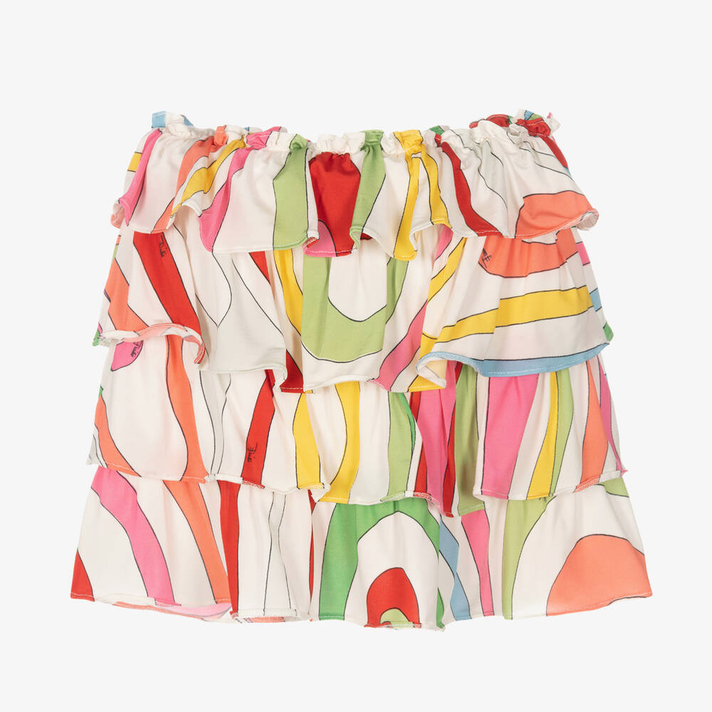 Beautiful white skirt for girls from Emilio Pucci. Silky and smooth, it has layered tiers which create volume and movement. It is printed with a colourful eye-catching Marmo pattern which is instantly recognisable as Emilio Pucci. It has an elasticated waist for stress-free dressing and comfort.