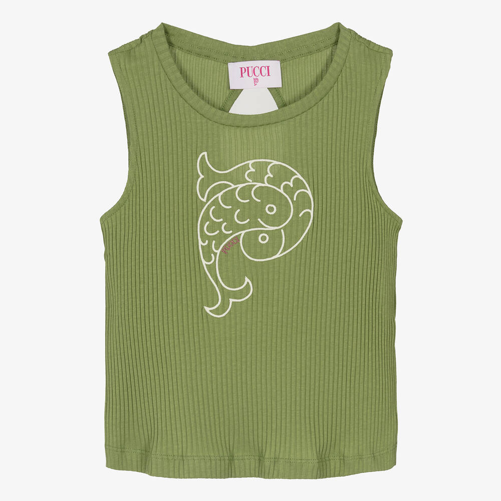A sleeveless green top for teen girls by PUCCI, embroidered with the luxury Italian brand's signature intertwining fish motif. Unmistakably PUCCI, this round-neck top features glittery pink lettering on the front. It is made in soft, ribbed cotton jersey and finished with an open, keyhole detail on the back.