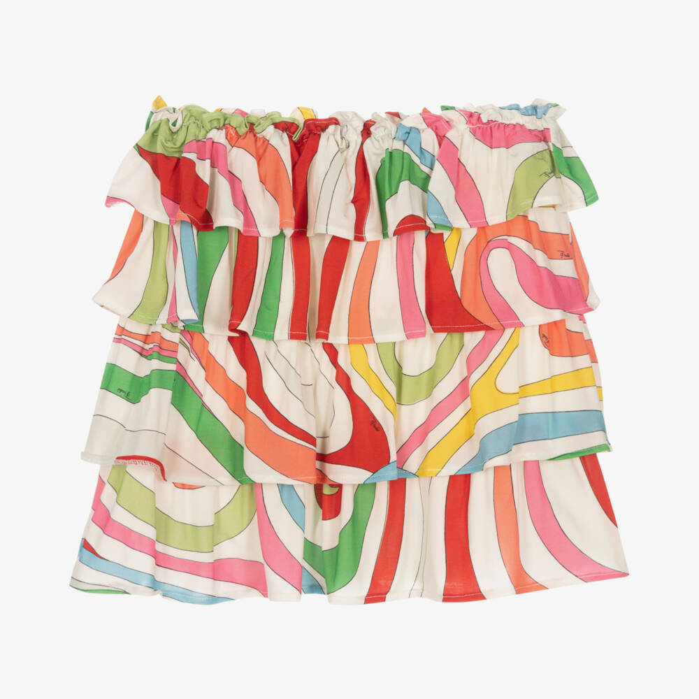 From Italian brand Emilio Pucci, white skirt patterned with a colourful Marmo print for teen girls. Silky smooth and lightweight, this beautiful skirt has layered tiers for a feminine silhouette and an elasticated waist for comfortable, easy wear.