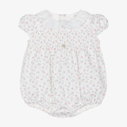 White and neutral beige shortie for baby boys by Pureté Du... Bébé, made in lightweight cotton voile and linen. This traditionally styled piece has a collared neckline, smart pintucks and stitching detail on the front. Fastening with mother-of-pearl buttons on the back, it has part lining and gently elasticated legs for added comfort.