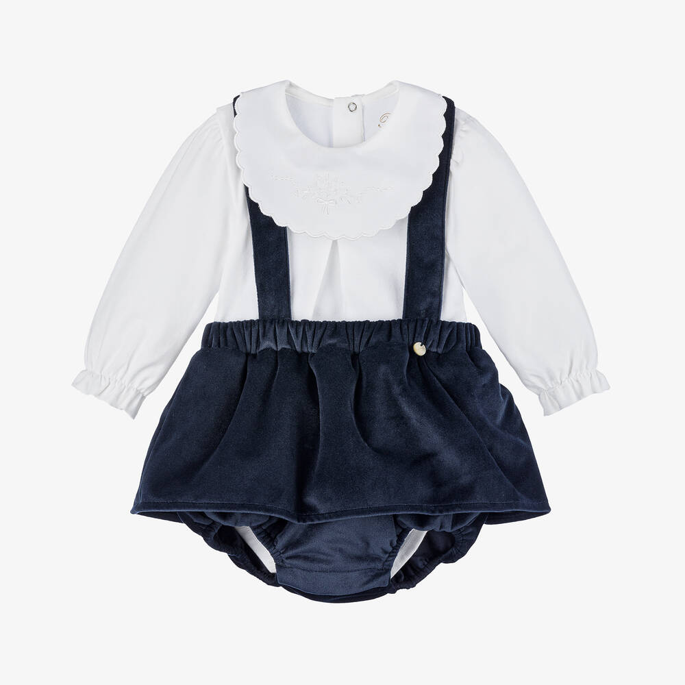 Lovely navy blue and ivory skirt set for baby girls by Pureté Du... Bébé. Made in supersoft, brushed cotton jersey, the bodysuit has long sleeves and a scalloped collar with pretty floral embroidery on the front. It fastens with poppers on the back and between the legs. The navy blue skirt is made in soft velvet. Lined in soft cotton, it has attached knickers and adjustable, button fastening shoulder straps. There are useful poppers between the legs to help with dressing and nappy changes.