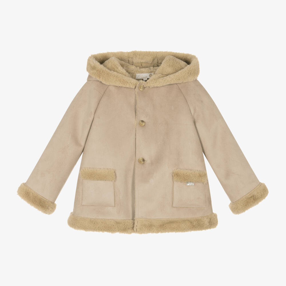 Beige hooded faux suede coat for little boys and girls by Portuguese brand Pureté du... Bébé. Beautifully soft, it is made in faux suede, with faux fur trims and a coordinating, warm faux fur lining. It has useful patch pockets and button fastenings on the front.