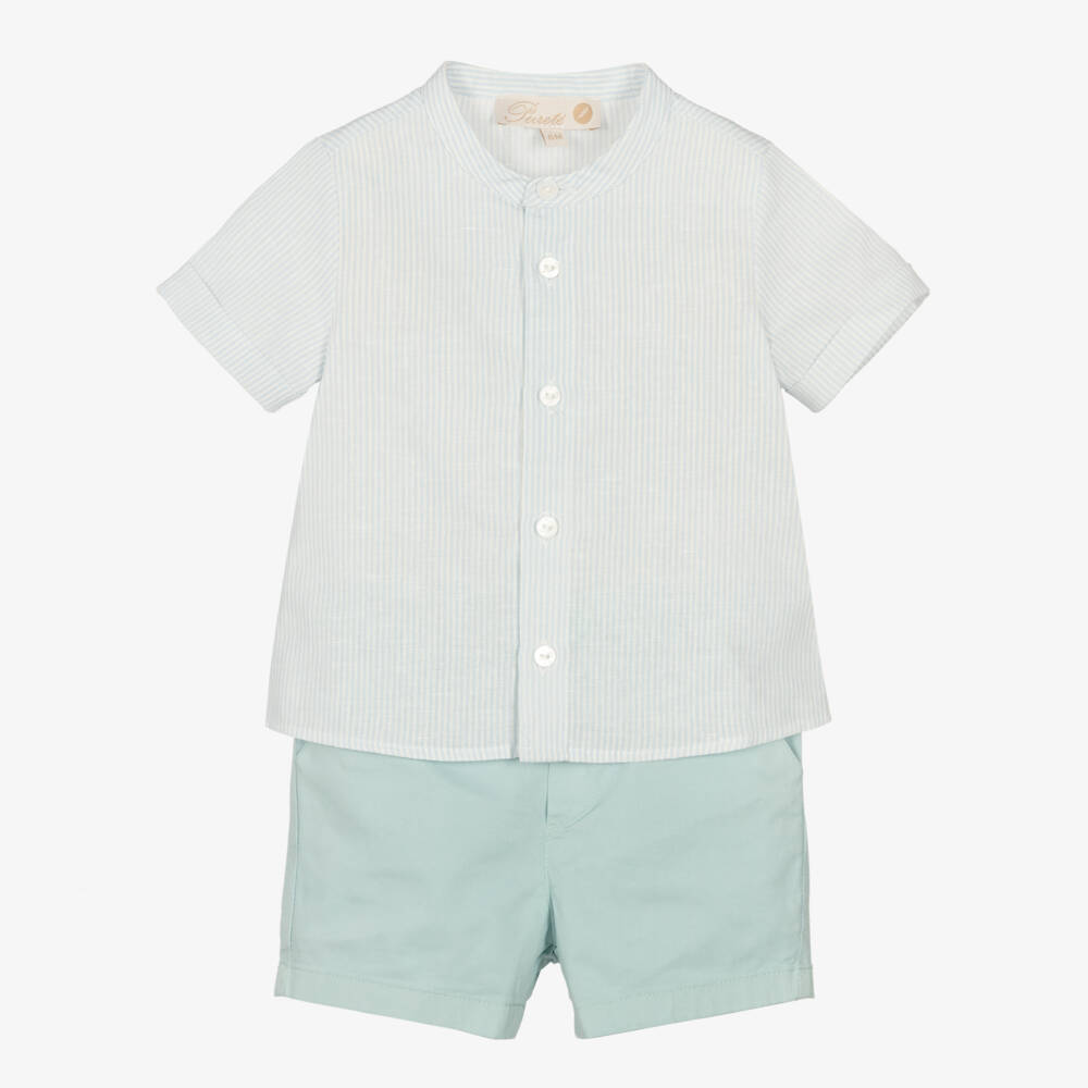 A classic blue shirt and green shorts set for little boys by Pureté Du... Bébe. Made in a soft cotton and linen blend, the striped cotton shirt is in a collarless style and has pearlised button fastenings down the front. In pale sage green, the cotton twill shorts are gently elasticated around the back and have an adjustable waist for the best fit. Fastening with a single button on the front, they have slanted side pockets and a branded tab sewn on the back.